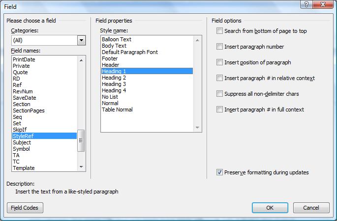 However, Microsoft Word contains a fantastic feature that will enable you automatically insert each chapter heading into the relevant page header. This also means that the header can be updated when content is moved or changed. And all without a single section break.