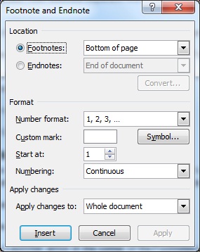 You can change the number format, change the starting number value or choose to start the footnote numbering again at the beginning of each page or section. All these changes can be made using the Footnote and Endnote dialog box.