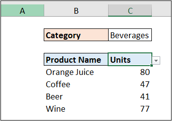 - include: The include argument is our filter criteria. In this case, we want to return the products from the product category stated in cell C2 only, currently beverages. So, our filter criteria will be when the [Category] column equals the value in the cell C2 e.g., tblSales[Category]=C2.