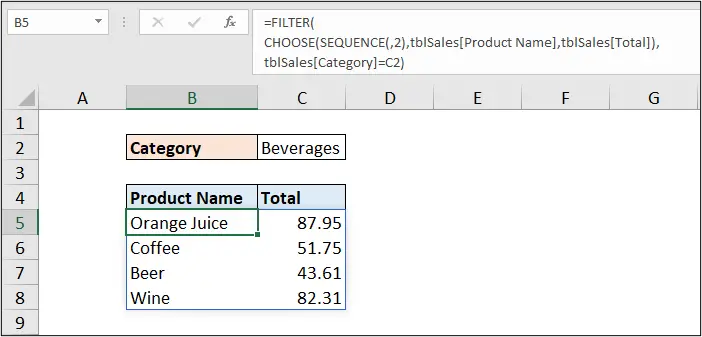 =FILTER(CHOOSECOLS(tblSales,1,4),tblSales[Category]=C2)